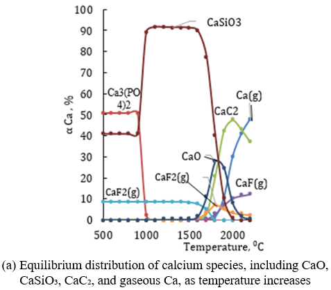 Calcium is present in the system in the form of Ca3(PO4)2, CaSiO3, CaF2, CaC2, CaO, CaF(g), and Ca(g). Meanwhile, CaC2 is factually formed from CaSiO3 at temperatures above 1,600℃. The maximum degree of transition of calcium into CaC2 is observed at 2,000℃ (47.42%). At 1700℃, gaseous calcium appears in the system via the reaction CaC2=Ca(g) +2C. At 2,000℃, 29.9% of calcium is lost with gas due to this negative process. At 1,800℃, gaseous fluorides CaF2 and CaF are formed, and another 13.6% of calcium is lost with them at 2,000℃.