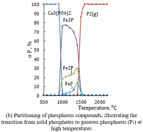 Iron phosphides (Fe3P, Fe2P, FeP2, and FeP) are formed at temperatures above 900℃, and all phosphorous is converted into them at 1,300℃. Following this, at temperatures above 1,400℃, gaseous phosphorus begins to form. The complete transition of phosphorus to the gaseous state occurs at 1,600℃. Thus, gaseous phosphorus is formed in the system through iron phosphides following the scheme: Ca3(PO4)2→iron phosphides→P2.