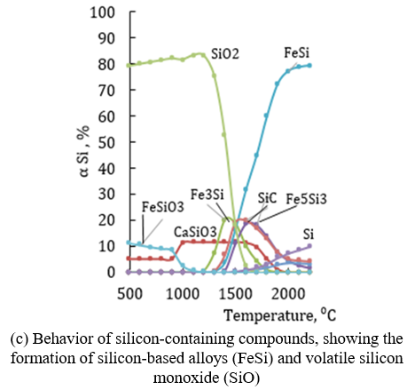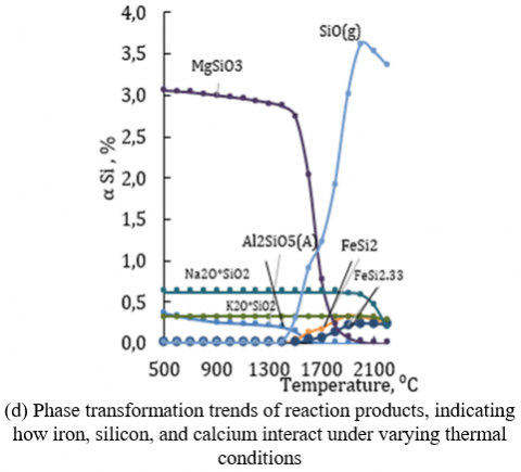 Figure 1 shows the equilibrium degree of partitioning of silicon, calcium, and phosphorus at 85% iron in the mass of PF. It can be seen that the main products of interaction depending on temperature are calcium, magnesium, and iron silicates and iron silicides (FeSi, Fe3Si, Fe5Si3), SiC, SiO(g), Si. In addition, silicon is transferred to a small extent (<1.0%) to sodium and potassium silicate and iron silicides-FeSi2, FeSi2.33, FeSi2.43.