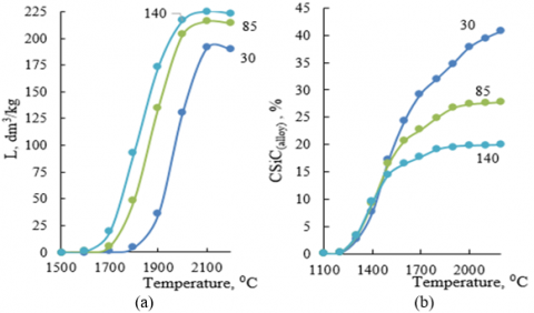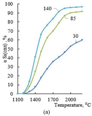 As can be seen from the table, based on CSi(alloy), the ferroalloy formed at 1,600-2,100℃ can be classified as a FeSi25 ferroalloy [26]. Calcium carbide has no grade. Nevertheless, it can be used in agriculture. For example, when calcium carbide is applied to podzolic soil, it is hydrolyzed to form calcium hydroxide and acetylene. Acetylene is then reduced by soil macroorganisms to ethylene, which, entering the plants through the root system, regulates their growth and development, increasing the yield of vegetables [27-29]. Figure 2 shows the effect of temperature and iron on the degree of extraction of silicon, calcium, and phosphorus into the target products.