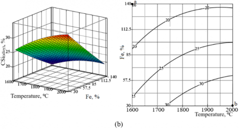 In view of the reverse character of the effect of higher amounts of iron on the technological parameters: αSi(alloy), CCaC2(carbide), and L increase while CSi(alloy) decreases; further studies were carried out using the method second order rotatable design. The study determined the influence of the amount of iron (Fe, %) and temperature (Т, ℃) on αSi(alloy), αCa(carbide), L, and CSi(alloy).