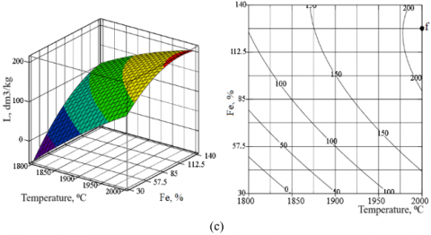 As can be seen from Figure 2, as the amount of iron increases from 30 to 140% αSi(alloy), αCa(CaC2) increases. For example, while αSi(alloy) grows from 46.2 to 95.2% at 1,900℃, αCa(CaC2) increases from 35.1 to 58.2% at 2,000℃. At temperatures higher than 1,600℃, virtually all phosphorus (99.9%) is converted to gas regardless of the amount of iron. The concentration of silicon in the alloy decreases markedly as the amount of iron rises (Figure 3). For instance, at 1,900℃ it goes down from 34.8 to 19.6%. In contrast, the volume of calcium carbide increases, e.g., from 130.4 to 216.3 dm3/kg at 2,000℃.