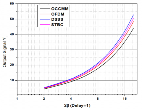 where, T is the integration interval, and L is the length of delay. This equation quantifies the system's ability to resist interference by enhancing the signal while reducing noise. The model was implemented in a MATLAB simulation environment with parameters such as carrier frequency (1–10 MHz), delay lengths (10-50 samples), and SNR values (0–30 dB). OCCMM outperformed the other conventional techniques OFDM, DSSS, and STBC with improved BER performances of about 0.30%, 0.27%, and 0.25% respectively under the same conditions. Its results point towards reliable application in OCCMM in unstable environments.