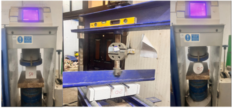Figure 4 illustrates the test devices for cylinders, cubes, and prisms. The shear performance of mixtures is evaluated by splitting tensile stress according to ASTM C496-17 [29-32] while the compressive strength of concrete is evaluated by applying a load vertically upon the cubes ASTM C39-18 [33] and BS EN 12390-1 [34]. The flexural strength as a modulus of rupture was tested according to ASTM C78-22 [35]. The mechanical characteristics presented are the average of three sample test results.