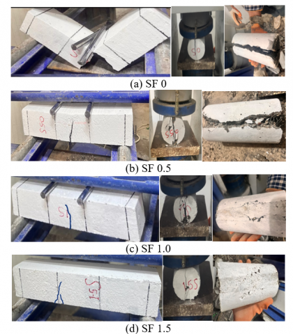 The failure modes in mechanical characteristics samples (prism and cylinder samples) are indicated in Figure 7. Prism specimen failure explains that a prism without steel fibre distributed and splits into two pieces because it is under reinforcement; the second with ${{V}_{f~}}$0.5% steel fibre has a wide crack failure, and the diameter of this crack decreased by using ${{V}_{f}}~$1.0% steel fibre in the third specimen. Meanwhile, the fourth one, which contains ${{V}_{f}}~$1.50% steel fibre, shows higher resistance against cracks and failure in the diagonal shear mode because the effective bond between concrete and hooked-end steel fibre assists against defects and cracks and absorbs energy from applied loads, which leads to improving toughness and making the RCB more resistant to failure [43].