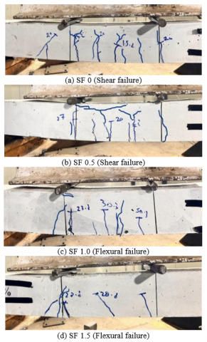 The RCB-0.5 with ${{V}_{f}}$ 0.5% steel fibre in a concrete mixture resulted in a composite material that enhanced shear resistance effects and improved the behaviour of the RCB-0.5; the concrete tensile failure mode happened due to shear forces. As a result, the crack width is decreased, and the stress distribution becomes more uniform compared to RCB-0. It also increased ultimate load and shear strength, lessening dependence on stirrups, as shown in Figure 10(b). The increase of steel fibre ${{V}_{f}}$ from 0.5% to 1.0% and 1.5% in the RCB1, and RCB1.5 appeared to gradually improve in post-cracking behaviour and fewer cracks’ distributions in mid-span; it occurred because hooked-end steel fibres enhanced shear resistance properties and depended on shear resistance on the main reinforcements of the RCB. This behaviour allowed for higher loads to be carried before shear failure occurred, and then its failure was flexural as appeared in Figure 10(c), and Figure 10(d) agreement with Kwak et al. [11], Yuan et al. [51], and Biolzi and Cattaneo [52].