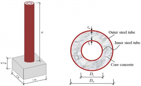 The column studied in this research is of the CFDST type, consisting of two steel tubes, with concrete filling the space between these two tubes. The specifications of the model and its dimensional parameters are provided in Figure 2 and Table 1.