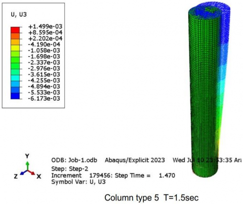 The results from the contours and displacement values in Models 1 and 5demonstrate a significant improvement in column resistance using Model 5. Specifically, the displacement values at the final moment decreased by up to 12 times between 1.5 seconds, and by up to 80 times at 2 seconds. This indicates a substantial enhancement in performance against explosive forces with Model 5.