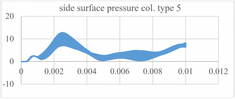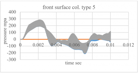 When we take specific points at the explosion level to monitor the compressive stress on the front, side, and back surfaces of the column, the results show that the stresses on the front at the beginning of explosion are more than ten times higher than side and back surfaces as shown in Figures 20 and 21.