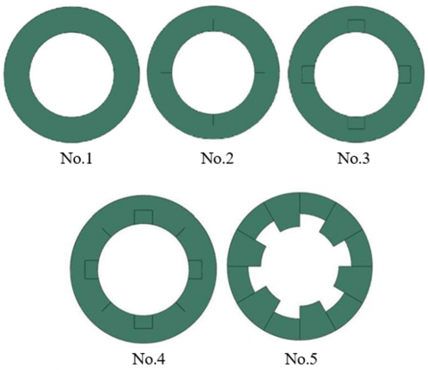 In this section, five CFDST columns are modeled in ABAQUS and subjected to explosive loading. The explosive load is applied using utilizing the Conwep feature in ABAQUS. The models feature a concrete section with an internal diameter of 500 mm and an external diameter of 800 mm, surrounded by two steel tubes with wall thicknesses of 5 mm on the inner and outer sides of the concrete. Model 1 has steel sections without reinforcements, while Models 2 to 5 include reinforcements, with their cross-sections illustrated in Figure 7. Additionally, the length of the columns is 5 m. The material properties for the steel and concrete sections are provided in Table 4.