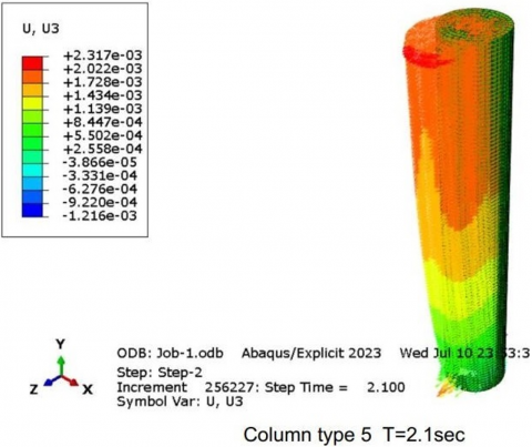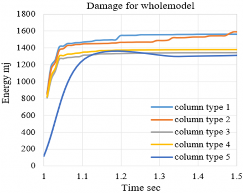 The amount of energy dissipated due to damage in the type 1 column model is greater than in the type 5 column model, indicating that the type 1 column model is weaker while the type 5 is stronger (Figure 18), and the displacement in columns number 1 is greater than in columns number 5 as shown in Figure 19.