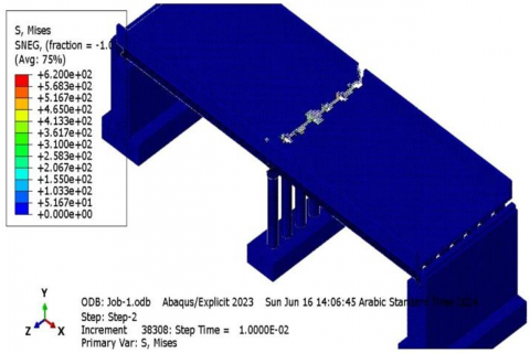In this section, the results related to the analyzed bridge are presented. As previously mentioned, the bridge featured Columns 1 and 5 and was analyzed under two explosion scenarios: one above the bridge and one beneath the bridge. Below are the results (stress, compression damage, tensile damage) for the analysis of the bridge when the explosion occurs above it and with type 1 CFDST columns. The list of results and the distribution of stresses on the bridge in the a those facing the explosion, exceed the yield strength of 420 MPa and reach the ultimate strength at 620 MPa.