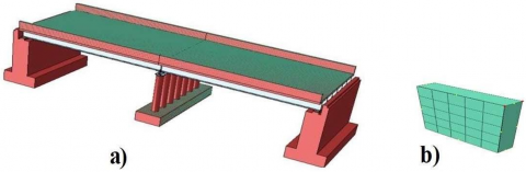 Figure 8. (a) Schematic of the bridge; (b) FE model of elastomeric pad