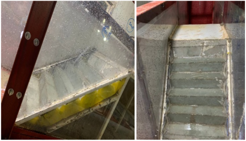 The steps for the model of the stepped spillway were made of normal and porous concrete as shown in Figure 6. The necessary laboratory tests were also conducted for the specifications of normal and porous concrete listed in Table 2. In this study, a series of laboratory experiments were conducted where six discharges 10.67, 15.43, 20.23, 25.15, 30.36 and 36.12 L/sec and three length ratios for porous concrete 33%, 67% and 100% were used in addition to normal concrete to compare the results of normal concrete with porous concrete. The results obtained from this study were also compared with the results of another laboratory study using the conventional spillway model, which was conducted in the same way.
