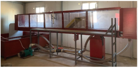 The laboratory experiments were conducted in a laboratory open channel with a steel structure and glass sides. The length of the channel is 7 m, its height is 0.8 m and its width is 0.5 m. This open channel contains a head tank at upstream to receive the water flowing from the pump, the purpose of this basin to dissipate the turbulence and eddies that occur as a result of the water exit from feeding pipe into this basin. At the downstream side, this open channel also contains an outlet tank to collect the water coming from upstream and falling to the main tank. where water is supplied to it by an electric pump as shown in Figure 2 and Figure 3. Two-point gauges were used in this open channel to measure the water depth and water surface profile along the reach.