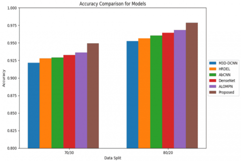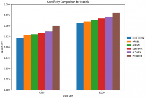 The comparative assessment of metrics such as sensitivity, FPR, FNR, and computational time are graphically presented in Figure 12. The sensitivity is a crucial parameter that determines the classifier's effectiveness in recognizing all correct (lung cancer instances) from the lung cancer cases that occurred. The presented methodology and the above-stated conventional models obtained a sensitivity of 0.94965, 0.92172, 0.92792, 0.92963, 0.3308, and 0.93673, respectively for 70/30 data split, while they achieved 0.98005, 0.95527, 0.95900, 0.96276, 0.96655, and 0.97037, respectively for 80/20 data split. The increased sensitivity in the designed model validates its effectiveness in identifying all lung cancer categories from both true and false positives. On the other hand, the FPR and FNR metrics are determined to estimate the error rate of the classifier. The designed strategy achieved lower FPR and FNR of 0.04312 and 0.03013 for the 70/30 data split, while it earned an FPR of 0.04110 and FNR of 0.02913 for the 80/20 data split. Subsequently, the above-mentioned conventional models achieved FPR of 0.5809, 0.05749, 0.05227, 0.04846 and 0.04524, and FNR of 0.03824, 0.03692, 0.03690, 0.03472, and 0.03160, respectively, for 70/30 data split. Also, they earned FPR of 0.05772, 0.05660, 0.05172, 0.04762, and 0.04412, and FNR of 0.03709, 0.03614, 0.03409, 0.03226, and 0.03061, respectively for 80/20 data split. The lower FPR and FNR in the developed algorithm highlight that it correctly classifies the healthy and lung cancer classes compared to existing models. Finally, the execution time is also determined to manifest the computational efficiency of the model. The presented algorithm consumed a minimum computational time of 7s and 12s for 80/20 and 70/30 data splits, while the existing models have taken longer computational times of the 20s, 19s, 15s, 15s, and 13s, respectively for 80/20 data split and 23s, 23s, 20s, 17s, and 17s, respectively for 70/30 data split. The reduced time consumption illustrates that the presented model quickly learns the feature representations and performs classification tasks. This also highlights that the parameter optimization by SWO minimizes the computational demands and training time. Tables 2 and 3 list the performance validation of the existing models with the presented approach for 80/20 and 70/30 data split.