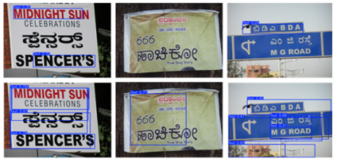 Figure 11 and Table 7 show the results of images of MSRA-TD500 dataset, first row contains results of without double edge component and second row shows results with double edge component (Double Yolo) model with 100 samples. It’s found that with degraded images resulted in more false negatives and f-score is much reduced in the absence of DE component.
