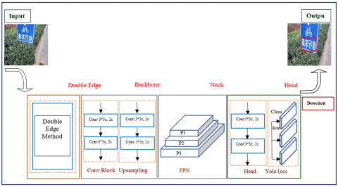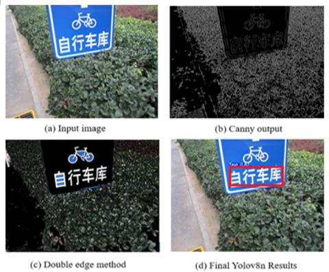 The double edge functionality block is depicted in proposed Double Yolo architecture diagram shown in Figure 2. Initially, the input samples are converted into grayscale to retain the edge information as shown in Figure 3(a). The canny edge detection algorithm is employed to generate the complete outer boundary of the text candidates and the outcome is depicted in Figure 3(b). The 2×2 kernel dilation is performed to connect the low resulted and disconnected edge information to generate double outer lines around the text regions. The double outer lines are visible as holes like structures. To extract complete region of text candidates, the hole like structures is filled with bright pixels. Finally subtract operation is performed between filled image (FI) and dilated image (DI) to obtain the potential text candidates (PTC) and mathematically represented using Eq. (1). Figure 3(c) and 3(d) show the output of double edge method and final yolo respectively.