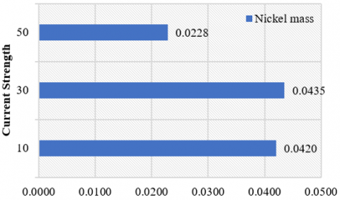 Figure 7 presents the data of electroplating treatment results with a treatment time of 3 minutes. Based on the data in the graph, it is known that the layer with a current strength of 10 A, the nickel mass is 0.0251 g, then the next treatment with a current strength of 30 obtained a nickel mass of 0.0258 g, and at a current strength of 50 A the nickel mass weighs 0.0138 g, as explained in Figure 6. A similar thing also occurs, namely at a current strength of 30 A, the weight gain is not ideal as per Faraday's law theory because the deposition is too fast so that some nickel ions do not stick properly, while at a current strength of 50 A the nickel mass is smaller than at current strengths of 10 A and 30 A, some layers experience thermal degradation.