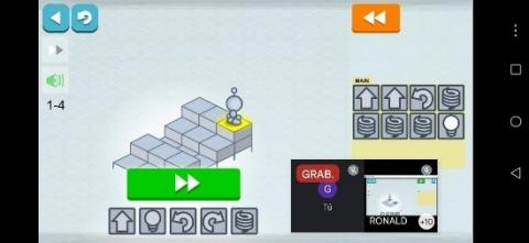 During the algorithm practice sessions with Lightbot, the children were introduced to the fundamentals of algorithmic design. They worked through the BASIC level of Lightbot, which consisted of eight exercises (1-1 to 1-8) focused specifically on developing algorithmic thinking. The children followed four key programming steps: planning, coding, execution, and debugging, to successfully program the robot. As shown in Figure 3, they programmed the robot to illuminate the blue tile using commands such as “Walk forward,” “Light up,” “Turn left,” “Turn right,” and “Jump.” The students constructed step-by-step sequences of instructions and inserted them in order within the MAIN area until they successfully completed the task of lighting the blue box.