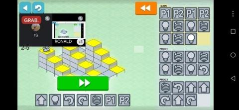 This section addresses a computational thinking skill developed during the PROCEDURES level of Lightbot, which includes four sub-levels (2-1 to 2-3). At this stage, children continue to apply the programming cycle—planning, coding, execution, and debugging—for each exercise. As shown in Figure 4, the virtual robot is programmed through a sequence of commands or instructions. A key feature introduced at this level is the use of the P1 command, which allows students to define reusable sets of instructions. To program the robot effectively, children first identify recurring patterns in the tasks. These repeated patterns are then coded within the PROC1 area and subsequently inserted into the MAIN area to complete the exercise efficiently.