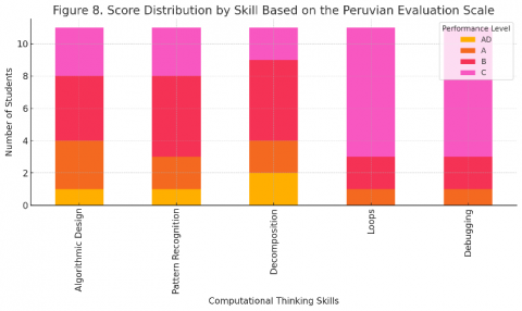 According to the evaluation scale of the Peruvian educational system, computational thinking skills were categorized as follows: AD (Outstanding Achievement, 18–20), A (Expected Achievement, 14–17), B (In Progress, 11–13), and C (Beginning, 0–10). Figure 8 shows the distribution of student scores according to this scale for each computational thinking skill.
