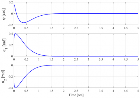 $x=\left[\begin{array}{llllll}\varphi & \dot{\varphi} & \alpha_1 & \dot{\alpha}_1 & \alpha_2 & \dot{\alpha}_2\end{array}\right]$