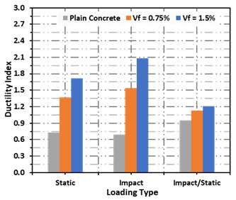 The ductility index values of the present paper also emphasized the previous works results concluded that increasing the fibers content leads to increasing the ductility of the structure. Occasionally, the present paper results revealed that the ductility of slab can be improved by increasing the nylon fibers content regardless of the loading type.