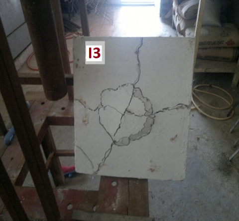 The impact loading, required for the other specimens, we conducted testing by a free-falling drop weight (blow). A steel ball of 1.033 kg mass and 63.2 mm diameter falls from 1500 mm height to strike the slab specimen positioned in a test frame. So that, the test frame is designed to accommodate different thicknesses and impact load capacities slabs.