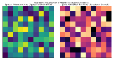 This adaptive attention effectively enhances the spatial representation by assigning dynamic importance to edges, thereby emphasizing joints that contribute significantly to gait identification. A mini‑diagram overlays a heatmap of the learned edge weights on the skeleton to visualize which connections are emphasized during a gait cycle.