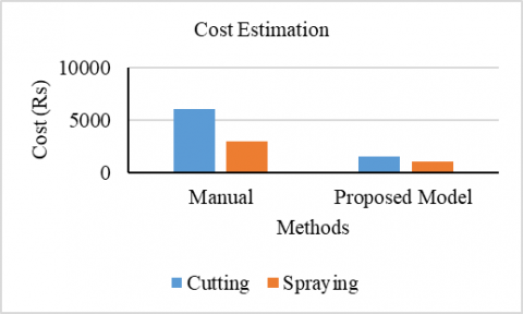 Figure 9 illustrates the cost estimation of both cutting and spraying in our proposed model. From this graph, the cost estimation for both cutting and spraying operations under the proposed model reveals substantial savings compared to manual methods, attributed to increased efficiency and reduced resource utilization.