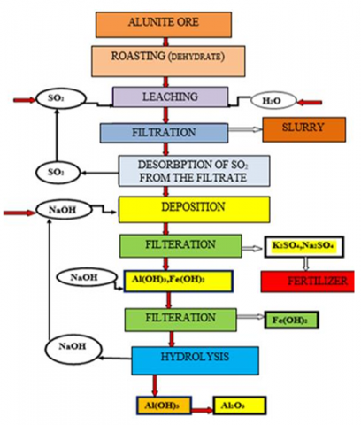 The present research builds upon earlier scientific advances in alunite ore processing, particularly the reduction-alkali method developed by the All-Russian Aluminum-Magnesium Institute and subsequent investigations on acid-alkali processing. Although these approaches enabled the extraction of alumina from alunite, effective industrial implementation was constrained by excessive alkali consumption, the complexity of desilication operations, and adverse environmental impacts.