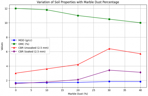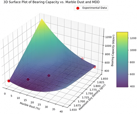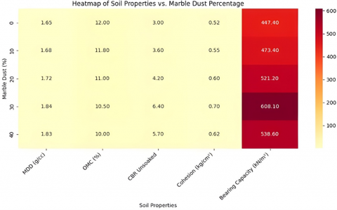 There is a recent development of the marble dust as a waste product of the marble processing industry as a promising and viable alternative in stabilizing problematic soils, such as the black cotton soil. Marble dust is generated in the process of cutting, polishing, and finishing, and it is about a quarter of the original mass of marble and mostly comprises carbonate of calcium (CaCO3), with some smaller amounts of silica and feldspar. The marble industry in India is flourishing, especially in areas such as Rajasthan and Tamil Nadu. Millions of tonnes of marble dust are produced every year in India. Large amounts of this waste are dumped in open areas and landfills, posing severe environmental issues like dust air pollution, land degradation, water pollution by calcium leachate, and loss of prime real estate. The recycling of industrial wastes through the use of marble dust in soil stabilization provides a dual environmental and economic advantage, as it not only alleviates pressure on landfill facilities and consequently on the surrounding ecosystem, but is also cost-effective in terms of cost and, in most cases, can be applied at under one third or fifth of the cost of lime or cement stabilization. Experimental research done in the past has recorded the use of marble dust as a soil stabilizer. It was established that marble dust decreased soil plasticity by breaking clay mineral orientation, increased maximum dry density (MDD) by better packing of particles, and greater bearing capacity, filling the voids and improving the formation of inter-particle carbide, by interacting with calcium carbonate [1, 2]. The common improvements have been MDD increase 1.65 g/cc to 1.84 g/cc (12% improvement), and the optimum moisture content (OMC) decreased to 10.5 (12-12) with an improvement in the bearing capacity of 30–50 at an optimum dosage. Nevertheless, there remains a severe constraint: the optimal dosage of marble dust can be in force only with the help of the extensive laboratory experiments on the various dosage percentages (0, 10, 20, 30, 40), test of numerous soil samples, and analysis of various geotechnical properties, such as compaction, California bearing ratio (CBR), unconfined compressive strength (UCS), settlement. The process has been cited as time-consuming, resource-intensive, and expensive, as well as requiring a large amount of technical expertise—a major limitation especially in the developing regions.