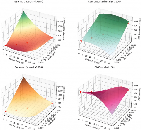 Table 1 shows the properties of blank cotton soil and marble dust, and Figure 1 shows the 3D surface.