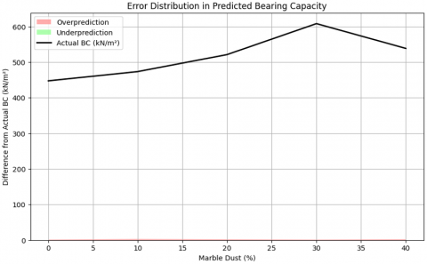 Figure 7. Error of prediction of bearing capacity across the marble dust contents using the Random Forest model