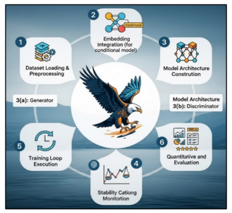 This section details the implementation of the generative pipeline to ensure reproducibility. The overall workflow, illustrated in Figure 2, encompasses sequential stages from the dataset loading and preprocessing to model evaluation.