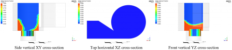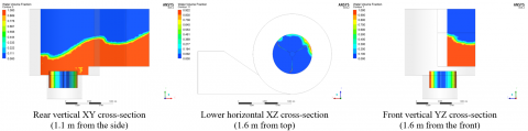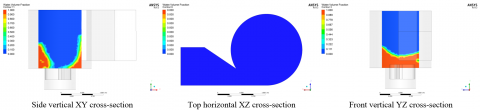 Figure 10 illustrates the water volume distribution for the 90° blade angle, supporting the findings of optimal hydrodynamic performance. The water volume pattern demonstrates a slender, focused air-core formed symmetrically at the vortex center. Unlike the 75° configuration, the free-surface boundary (the transition between fractions 0.100 and 0.900) appeared smoother and more consistent. This pattern substantiates the formation of a stable vortex with minimal power loss.