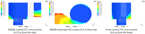 Figure 8 displays the velocity contours for the 105° blade angle, which resulted in significant performance degradation due to severe hydrodynamic instability. The velocity distribution around the intake area and upstream of the blades appeared diffuse. Although high peak velocities were recorded (3.260 to 4.657 m.s⁻¹), the flow failed to establish the compact vortex ring observed in the 90o configuration.
