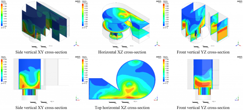 Figure 8. Velocity distribution of the vortex chamber at 105° blade angle (various cross-sections)