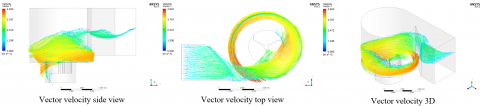Figure 6 illustrates the velocity contours for the 75o blade angle, which represents a configuration with suboptimal efficiency. As water enters the zone above the turbine, the velocity distribution varies predominantly between 1.548 and 3.096 m.s-1. Despite initial vortex formation, the 75o angle generated low flow stability, as evidenced by the non-uniform velocity contours within the intake area. Rather than establishing a dense, symmetric vortex ring, the velocity pattern appeared fragmented, indicating an unstable vortex structure.