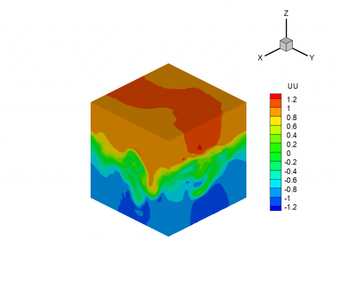 The mixing layer is solved in a cube domain [-15,-15] × [-15,-15] × [-15,-15], where the streamwise, spanwise and normal directions are denoted by x1, x2 and x3, respectively. Boundary conditions in the stream wise and span wise are periodic. Free-slip walls condition is considered in the normal direction. A three dimensional uniform structured mesh is built in the Cartesian coordinate. The mesh size is 64*64*64 along the x, y and z axes, respectively. The time step of flow simulation is chosen to be 0.01 second and the numerical results are obtained at different times which are equal to iterations multiply to time steps.