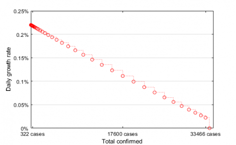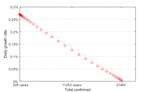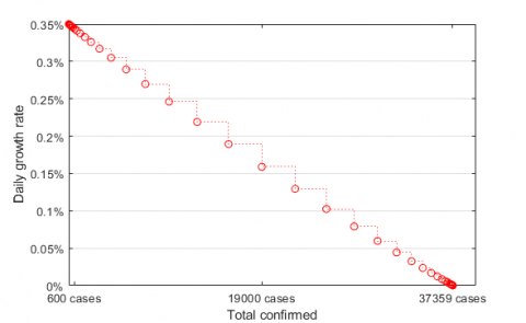 When the number of the cases reached 19385, the growth rate declines from 0.15% to 0.11%. Consequently, to not overload the health care system, the growth rate should decrease before the number of cases reaches 19385 cases. Hence, if we assume that on average the number of cases doubles every 5 days, this is mean that strict social distancing should be started 15 days before 19385 cases is reached. In other words, when 2423 cases is reached. Of course, the tests have to be done as soon as possible on a large population.