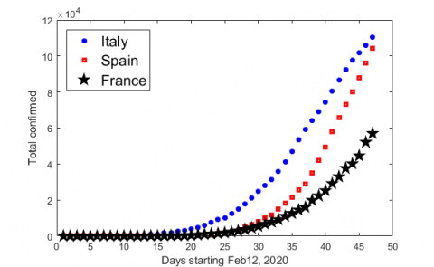 In this modelling study, we focus on the daily total coronavirus cases in Italy, Spain and France. The data were collected from worldometers web site https://www.worldometers.info/coronavirus. We study the data from Feb 15 to April 1. In 47 days, 110574 cases were confirmed in Italy, 104118 in Spain and 56989 in France.
