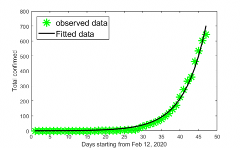 where, Y(t) is the observed data (number of cases) at day, t=0, Y0 is the expected initial number of cases (at t=0) and r is the growth rate of the model. We estimate the unknown parameters (Y0 and r) with the function fitnlm from the Statistical and machine learning toolbox in Matlab (https://www.mathworks.com/).