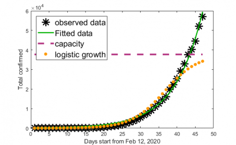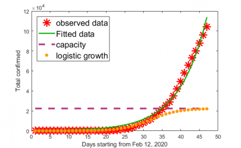 As shown in Figure 5, at the early stage, the fitted data increases rapidly until the number of cases reaches$\frac{38700}{2}$=19385 for which the growth rate is at its maximum. Then, the growth rate remarkably slows. As detailed in Figure 6.