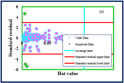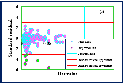 On the condition of implementing statistical approaches or training machine learning algorithms, outliers or anomalies could be mentioned as a severe concern. They are generally made due to the measurements’ errors or excellent systems conditions, as the result cannot illustrate the prevailing functioning of the underlying system. Certainly, applying an outlier removal phase before proceeding with additional investigation can be stated as the exceptional practice. The leverage value procedure applied as an outlier detection method in this study. The Hat and the residual values of any input were calculated. The following formulation applied to calculate the Hat matrix: