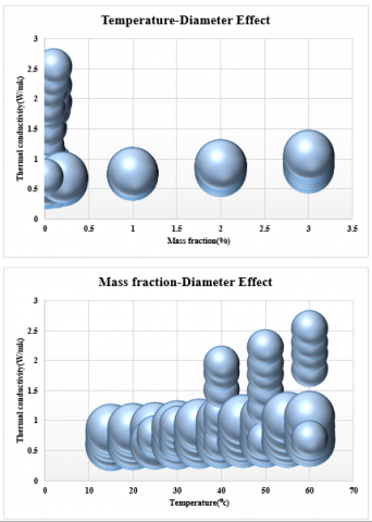 In the current paper, three analysis and model building procedures were applied for estimating the nanofluid’s thermal conductivity. Figure 3 shows the bubble curve of thermal conductivity versus the mass fraction and temperature in which the size of each bubble is dependent on the size of particles. Resulted data form experimental section of the study at the first step are used to train the models. Just about 25 % of data are used to test the models. A normalization process according to the equation 26 was done to normalize data: