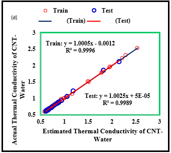 Figure 9. Regression diagram to predict thermal conductivity using different models in the training and testing steps; (a) ANFIS, (b) MLP-ANN, (c) RBF-ANN, (d) LSSVM