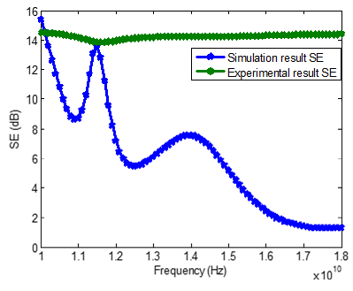 Figure 5. Comparison between experimental and simulation results of SE behavior composite (Sample E) at 'E' band frequency