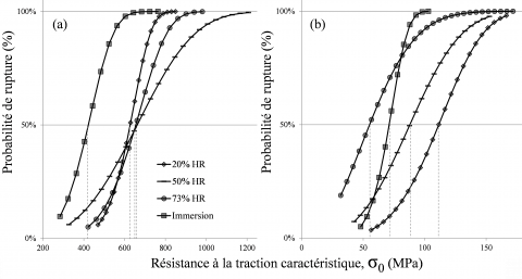 La probabilité de rupture des faisceaux de fibres en fonction de l’humidité relative a été étudiée en utilisant une approche statistique de Weibull à 2 paramètres, comme le montre la Figure 5 pour les faisceaux de fibre de lin et de palmier. Plusieurs auteurs ont déjà utilisé cette approche, comme Silva et al. [11] pour les faisceaux de fibres de sisal et Placet et al. [7] pour les fibres élémentaires de chanvre. Le module de Weibull, qui décrit le degré de dispersion de la résistance à la rupture, est associé à l'hétérogénéité de la microstructure des faisceaux et notamment l'hétérogénéité de distribution des défauts. La détermination des paramètres de Weibull comme la résistance à la traction caractéristique notée « σ0 » et le module de Weibull notée m, a été faite sur la base d’une minimisation au sens des moindres carrés, pour une probabilité de rupture de 50 %.
